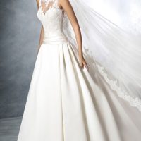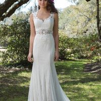 The satin creation features a chic cuffed neckline with cap sleeves while the banded waist accents the bride’s curves.