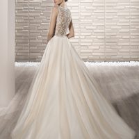 The designer’s popular Mae design gets a colorful facelift with the Mae II gown, featuring a structured lace satin tulip tank.