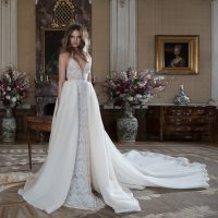 The dress also features a deep straight neckline, off-the-shoulder straps, boning in the corset, and a silhouette that is absolutely sensual and sultry. There’s a draping under the waistline and a long train that is also with beaded lace details.