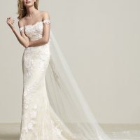 The Florentine dress features a versatile, A-line silhouette, with illusion tulle and lace appliques, a scalloped illusion neckline, and there’s even a veil you can purchase to match the dress itself.