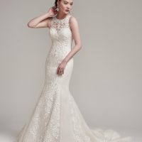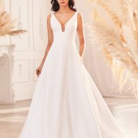 This is a traditional gown with feminine flair that is easy to love and easy to wear. It is one of the more versatile silhouettes and it is easy to style within a personal style genre as well as an event’s.