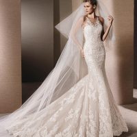 The silhouette is of the fit-and-flare style – which is extremely flattering when you are wanting to accentuate curves and there is some vintage lace added to different areas of the dress that we are swooning for. Take a peek at the back accents and train.