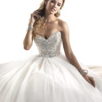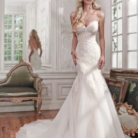 It features floral and petal embroidery, keyhole back, full skirt, A-line frame, natural waist, and horsehair trim for the best experience in photographs and on the dance floor. That trim will ensure that the silhouette’s shape it kept throughout the entire night of celebration.