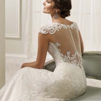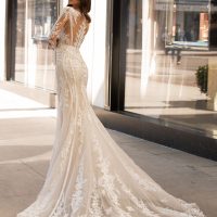 The silhouette is of the fit-and-flare style – which is extremely flattering when you are wanting to accentuate curves and there is some vintage lace added to different areas of the dress that we are swooning for. Take a peek at the back accents and train.