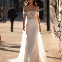 Here’s another design from Martina Liana that we are swooning for. This glam, off-the-shoulder beauty – complete with a V-neckline – is a stunner!