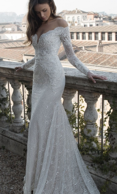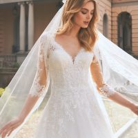 If you have been on the hunt for a long sleeve lace bridal gown with an off-the-shoulder neckline and low back – and detachable sleeves, today is your lucky day.