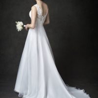 The strapless neckline has a deep plunge and compliments the gorgeous back with a cascading, illusion lace train. It accentuates a feminine curve beautifully and won’t hold back in making one feel like the ultimate bride.