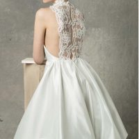 This design features a soft tulle skirt, corset bodice, mini dress lining, a straight neckline, and band-like sleeves. There are so many unique qualities to this dress. At first, it is understated but when you start really taking in all the features you recognize what a distinct difference this dress can make.