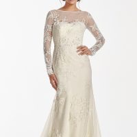 This full-coverage lace gown is elegant and comes with a custom lace applique from Watters. It’s a layered look and comes with a separate slip as well.