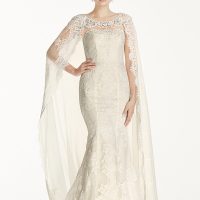 Its comfortable, crepe fabric, lace accents, and body-hugging lines make this a woman’s dream for her walk down the aisle.