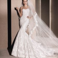 The design features a stunning train, vintage lace, and a strapless, sweetheart neckline.