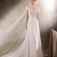 Covered in head-to-toe floral lace, this lightweight design features large bell sleeves for a memorable look. It’s a modern touch to an overall classic-looking design. A low back is a sensual nod and a sweeping train gives the column silhouette some depth.