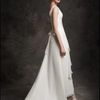 For effortless elegance, the Celine gown is a beautiful choice. Made of luxurious stretch silk, the figure-flattering gown features the designer’s signature side and back ruching to sculpt the bride’s body and enhance the sheath silhouette.
