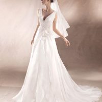 Here’s another traditional find that has a versatile silhouette. It features an illusion lace bodice and stunning skirt made to flow down the aisle. There’s a ribbon belt included to finish off the look or you can add your own bedazzled sash. *The design is also available with short sleeves.