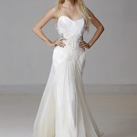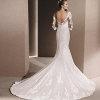This classic, lace design is both sensual and modest. With a bohemian foundation – check out those slight, bell sleeves – it has beautiful accents that accentuate a woman’s body in all of the right ways. The gown features a combination of allover lace, sheer lace, and a York jersey material.