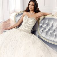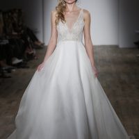 If you’re in the market for a ball gown, this stunning Moonlight Couture piece may be your choice. It has a timeless quality that more sophisticated brides will love along with the comfort of coverage. The billowing sleeves are such a unique feature for this type of dress – for brides who want to make a statement.