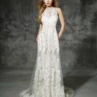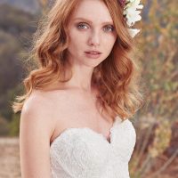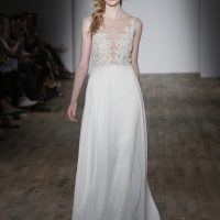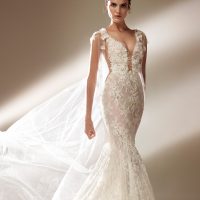 This classic, lace design is both sensual and modest. With a bohemian foundation – check out those slight, bell sleeves – it has beautiful accents that accentuate a woman’s body in all of the right ways. The gown features a combination of allover lace, sheer lace, and a York jersey material.