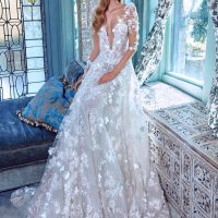 A plunging V-neck and V-back add a touch of drama and whimsy. It is a lovely gown that is a mix between traditional and modern bridal styles. We love the floral lace appliques on the skirt as well.