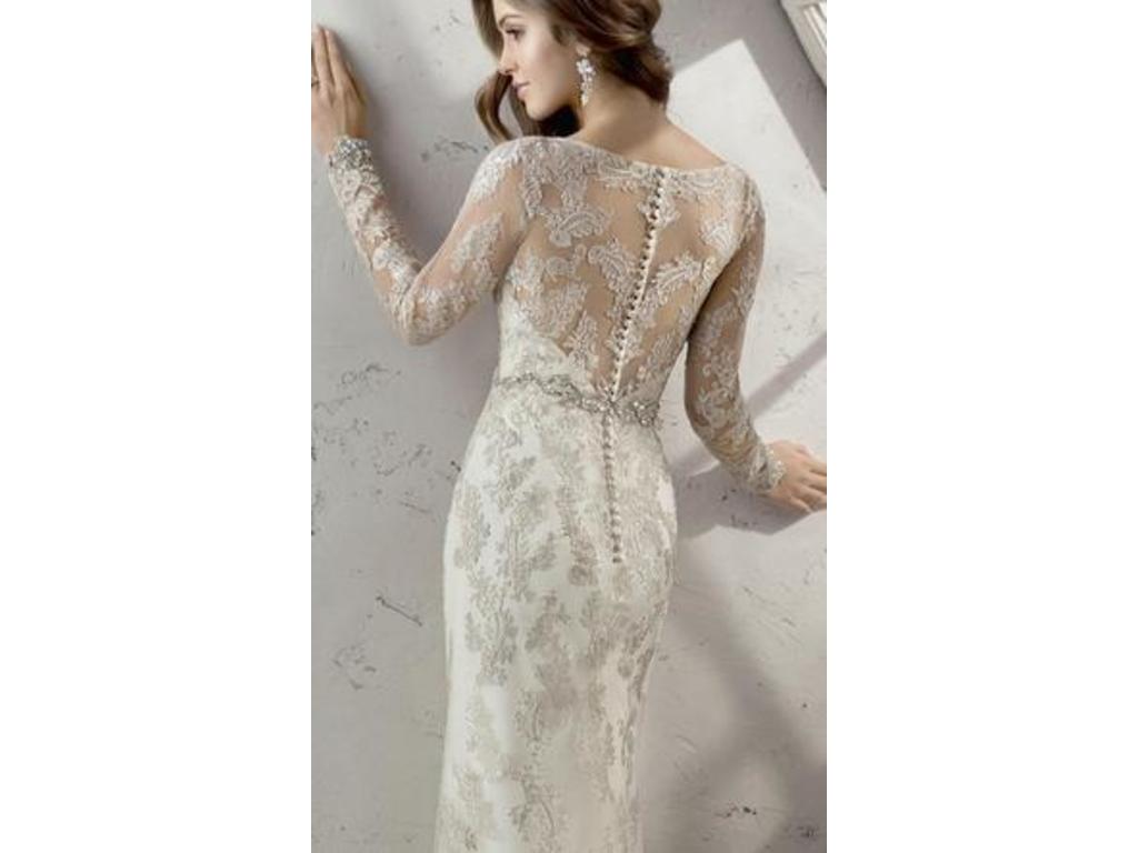For example, the Anastasia gown from Sottero and Midgely is made with the most beautiful metallic lace. A silhouette that hugs the body, and a sheer illusion back and long sleeves are modern design elements that elevate your sense of style.