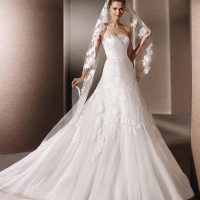 It is a beautiful and timeless strapless tulle and lace ball gown with back overlay and rich beaded lace border at hemline and overskirt. The full skirt is so dreamy, definitely more of a traditional bridal look.