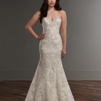 A little drama with the deep plunge neckline and low back, but this gown fits like a second skin and will have your spouse drooling in no time. Purchase Galia Lahav, style 708, and pair it with a long, cathedral-length veil for a dramatic and quintessentially bridal look.