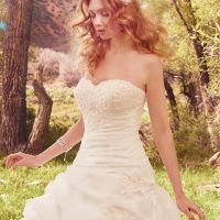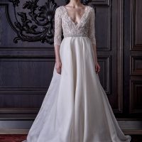 One of the most common necklines on a wedding dress is the v-neck or also known as the “plunging” neckline. This neckline can be a sophisticated, and sometimes sexy, accent to a wedding dress and works well with a number of silhouettes.