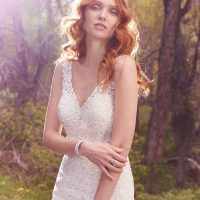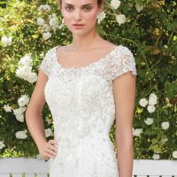 For extra chicness, choose a sophisticated silhouette like sheath or mermaid. A lot of brides go for a ribbed corset top that has sheer patches in between the boning. Finish the look with shiny accessories like sparkly high heels or a glittery headpiece.