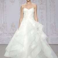 Go big or go bold with lots and lots of layers! There’s one of two ways to wow your guests with this daring approach: find a dress with all the layers built in, or go for a detachable skirt option. With the first option, you’re in it to win it and should own that voluminous fabric from the ceremony to the final dance. Be sure to consider your venue and figure out how much space you’ll have to walk down the aisle because you’ll need a full catwalk to strut your stuff. Complete the look with a dark smokey eyeshadow and wavy, textured hair.
