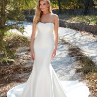 Boxy, structured silhouettes reigned in the ‘60s, along with shorter skirts (including miniskirts) and baby doll dresses. Anything that was considered fun and daring was popular—like metallic details, oversized elements, flair sleeves, and funnel necks. Many brides ditched the long train and veil and opted for crowns, floral headbands (especially daisies), and hats.
