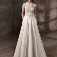 Talk about a show-stopper! Monique Lhuillier Sunday Rose is a dramatic and romantic wedding dress. Created in silk satin organza the dress features intricate (and stunning!) roses throughout the A-Line skirt.