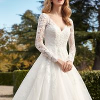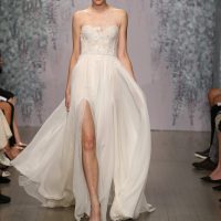 We also love the two bridal styles on the right. The bride on the top right boasts regal flair (more of a ‘50s trend), but she did opt for a shorter veil and a stunning crown. The bride on the bottom right is probably the most traditional, but we love her unique sleeve details and gloves.
