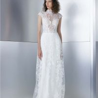 Boxy, structured silhouettes reigned in the ‘60s, along with shorter skirts (including miniskirts) and baby doll dresses. Anything that was considered fun and daring was popular—like metallic details, oversized elements, flair sleeves, and funnel necks. Many brides ditched the long train and veil and opted for crowns, floral headbands (especially daisies), and hats.