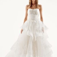 Like the poodle skirt trend, wedding gowns of the era featured full, poofy skirts, meaning ballgowns and swing dresses were popular. Trains and veils were long, but some brides went shorter with their sleeves, including off the shoulder and strapless.