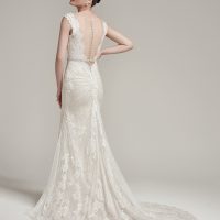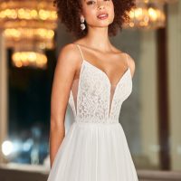 Boxy, structured silhouettes reigned in the ‘60s, along with shorter skirts (including miniskirts) and baby doll dresses. Anything that was considered fun and daring was popular—like metallic details, oversized elements, flair sleeves, and funnel necks. Many brides ditched the long train and veil and opted for crowns, floral headbands (especially daisies), and hats.