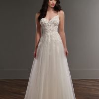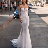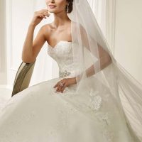 We also love the two bridal styles on the right. The bride on the top right boasts regal flair (more of a ‘50s trend), but she did opt for a shorter veil and a stunning crown. The bride on the bottom right is probably the most traditional, but we love her unique sleeve details and gloves.