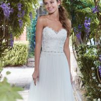 Like the poodle skirt trend, wedding gowns of the era featured full, poofy skirts, meaning ballgowns and swing dresses were popular. Trains and veils were long, but some brides went shorter with their sleeves, including off the shoulder and strapless.