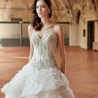 With all the right accents, you’ll be getting a gorgeous gown at a great price point with this design. Romantic and flowing, all eyes will be on the bride – especially sashaying on the dance floor – in this golden number. It also comes in both white and champagne.