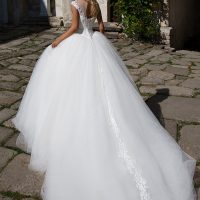 Gorgeous floral lace surrounds this classic silhouette and high-neck design. At first glance, it’s a traditional beauty, but it’s got a chic, contemporary vibe that fits the time too. You receive coverage as well as a boost of bridal confidence in this one.