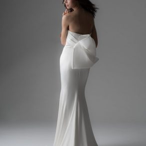 The dress includes some feminine and poised details such as Mikado fabric, a voluminous A-line silhouette, a sweetheart, portrait neckline, a plunging back, and a chapel train.