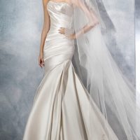 Swarovski crystals are hand sewn into the detailing making sure you are shimmering as you walk down the aisle, and there’s a corset closure and a bow accent highlighting the curves of the silhouette.
