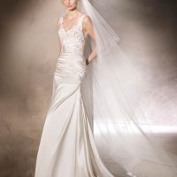 The simple and clean details on this ball gown put a modern spin on a timeless silhouette. There’s a plunge to the neckline and you can accessorize so easily to your liking by adding a variety of ribbon waists or belts to the ensemble.