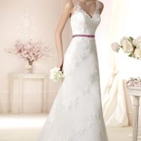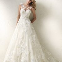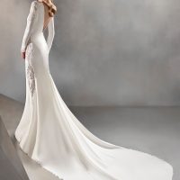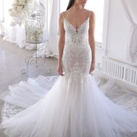 The design also features a low, scoop back. An illusion lace slit enhances the skirt. And there’s a chapel length train to finish off your walk down the aisle.