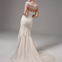 Features of this design include that multidimensional custom beadwork, a sultry silhouette, square neckline, and semi-sheer bodice.