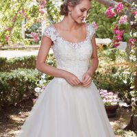 We certainly are loving the “Maddox” ball gown from Sottero & Midgley. This A-line gown is made with light and flowing organza while being topped with cottagecore lace detailing.