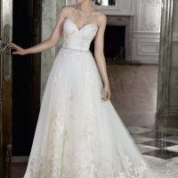 Another high-profile couple: Katie Holmes and Tom Cruise. The couple wed in a beautiful castle in Rome in 2006. Katie’s gown was designed by the couple’s friend and wedding guest Giorgio Armani—an off-the-shoulder silk and lace stunner. It took 350 hours to place the Swarovski crystals all over the gown.