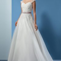 Eden features a scoop neckline and illusion cap sleeves.