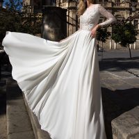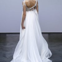 Eden features a scoop neckline and illusion cap sleeves.