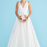 This gown doesn’t have any embellishments, and it really doesn’t need any, but a pair of statement earrings and a matching bracelet would be perfect accessories to add. Bonus: this style is also available in plus, petite and extra tall to fit every type of bride.