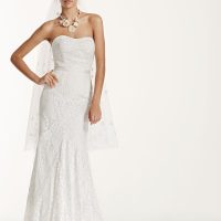 We’re going totally sexy for this next modern design. The satin-and-lace mermaid gown is ultra glam. The stretch satin fabric hugs the bride’s curves perfectly, while asymmetrical pleating wraps the waist and sits above the sensual skirt slit.