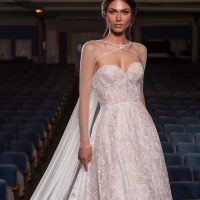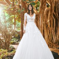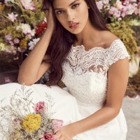Romantic, elegant and classic are such perfect descriptors for the Monique Lhuillier Scarlet wedding dress. Created in white or ivory the gown features reembroidered lace, a juliet neckline and a keyhole back. This dress will undoubtedly be a beloved style for years to come.